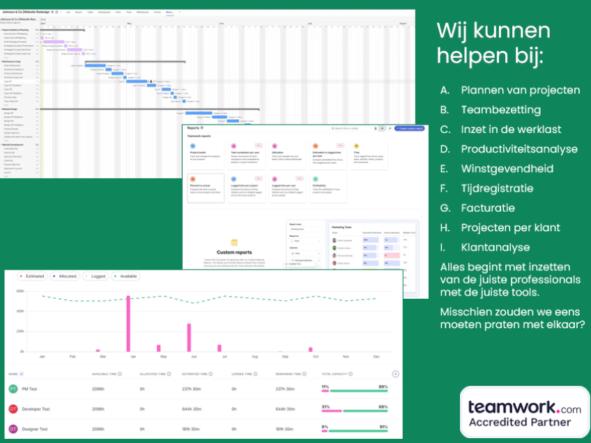 Statement met de mogelijkheden van Teamwork.com. Projectmanagement voor professionals. Wij zijn accredited partners.
